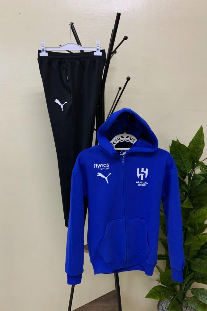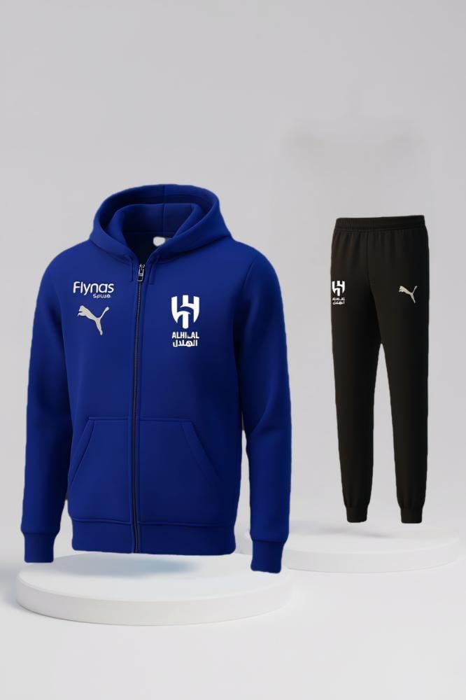 يتكوّن من هودي أزرق بسوّستة أمامية وشعار الهلال مطبوع بجودة عالية، مع بنطلون أسود بخامة خفيفة ومرنة تمنحك حرية حركة مثالية أثناء التمارين أو الإطلالات اليومية.