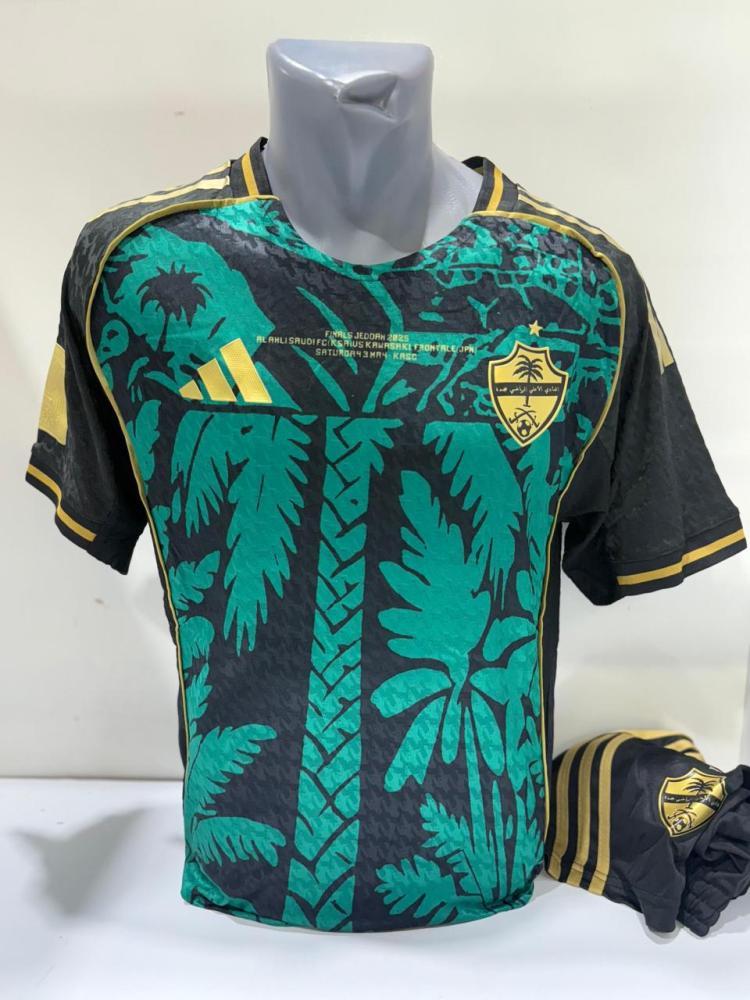 طقم الأهلي النخبة الجديد 2025 يأتي بتصميم يجمع بين الفخامة والهوية السعودية، حيث يظهر بنمط نخيل أخضر بارز على خلفية سوداء عصرية مع لمسات ذهبية تمنح الطقم مظهرًا ملكيًا يتناسب مع عشاق الأهلاوي.