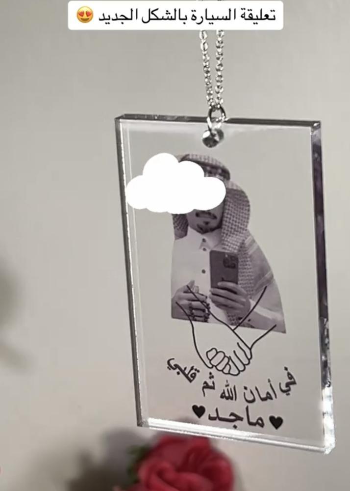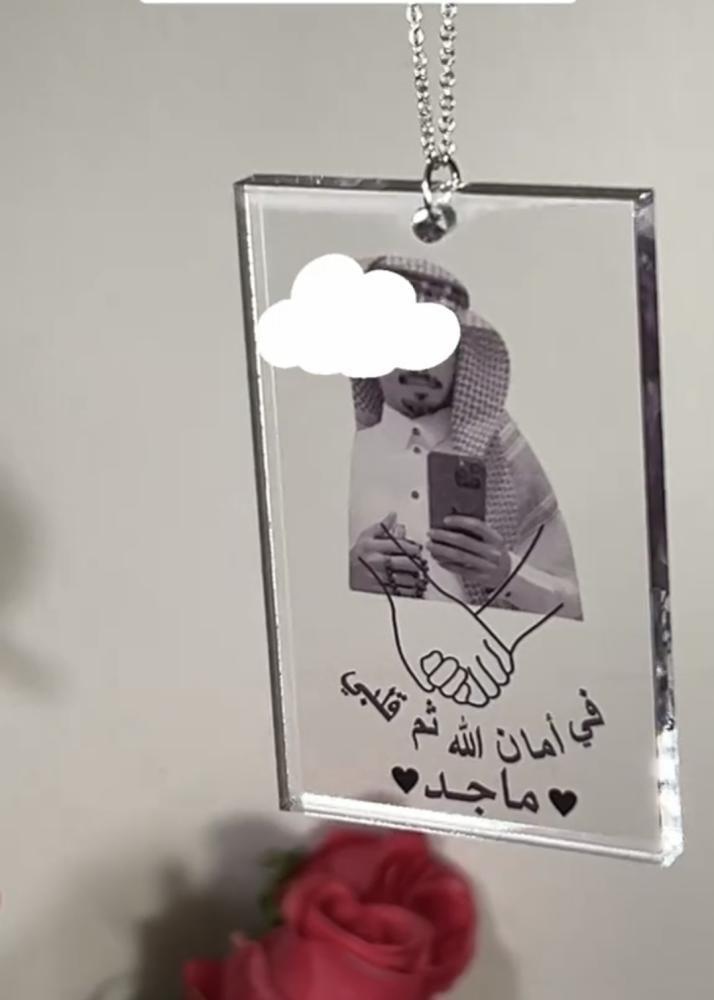 تتميز بإطار زجاجي شفاف يضفي عليها لمسة راقية وفاخرة. بداخلها صورة شخصية مزينة بخط عربي جميل يحمل عبارة روحانية "استودعتك الله"، مما يجعلها مثالية للاستخدام في السيارة كقطعة تذكارية تحمل معنى عميقًا.