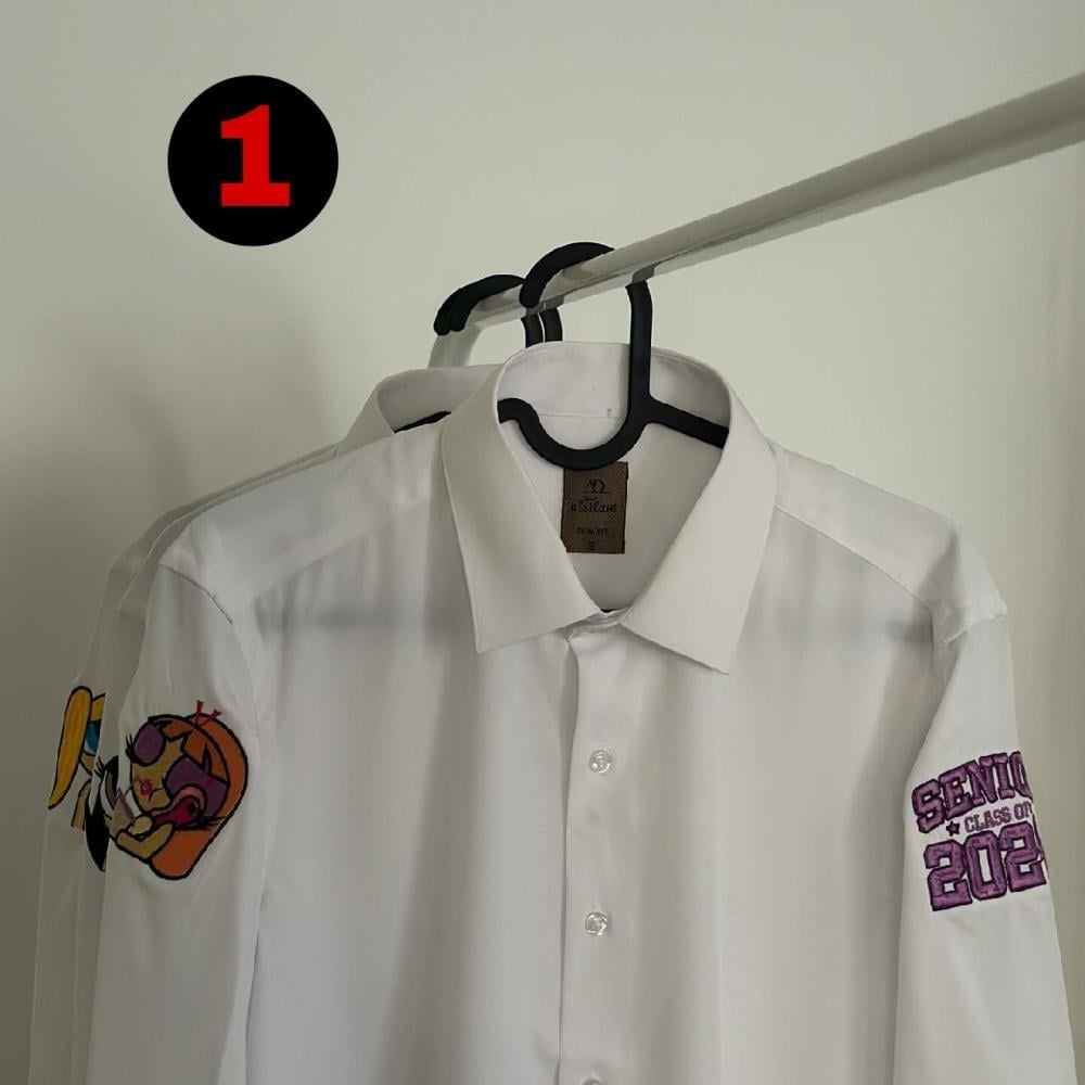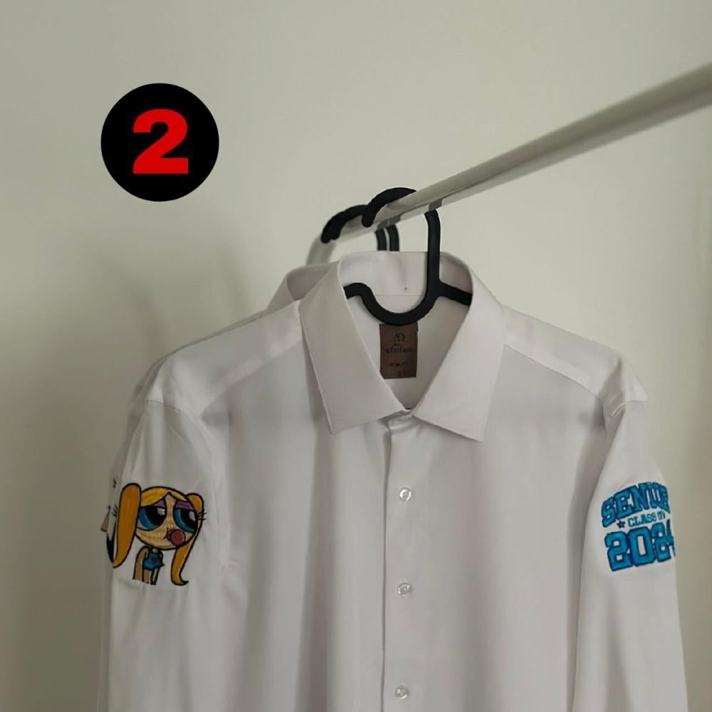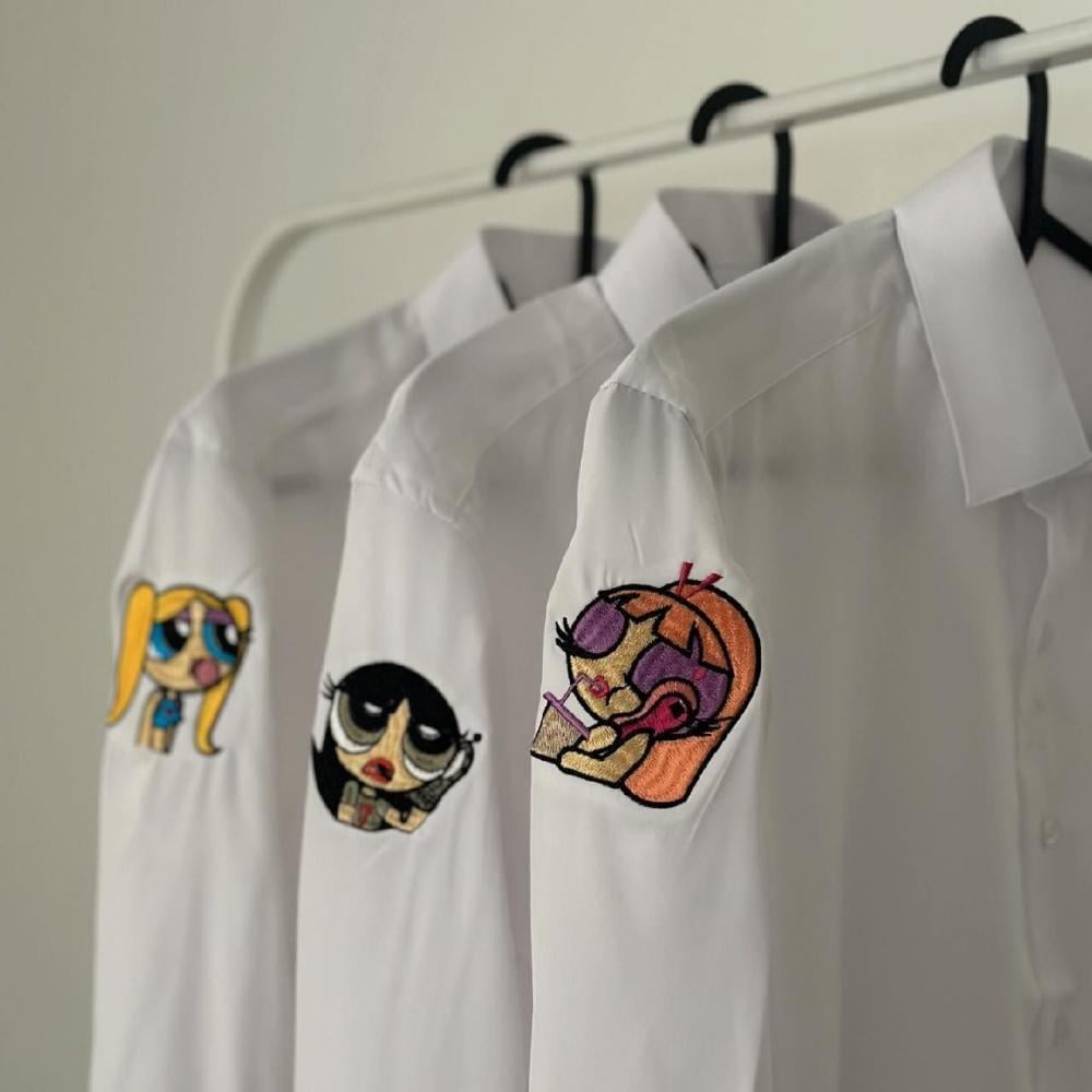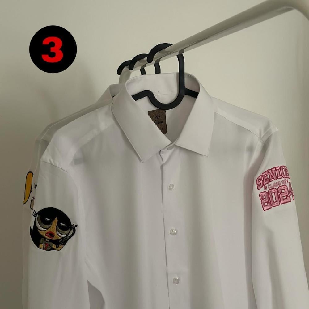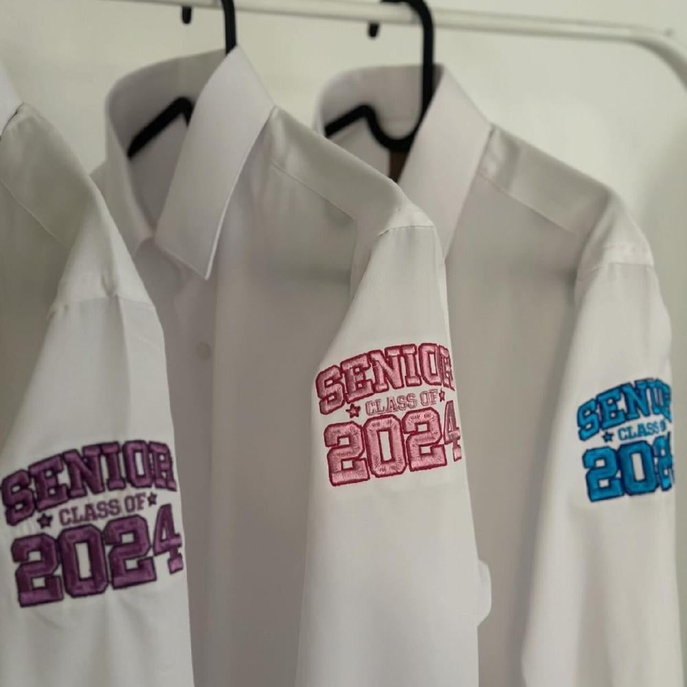 قميص مدرسي بأكمام طويلة و ياقة مثلثه نوع القماش هندي فاخر بتطريز صورة فتيات القوة على اليد اليسار مع تطريز SENIOR 2025 على اليد اليمين