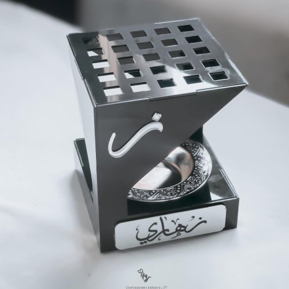 يتم وضع الاسم و الحرف المطلوب من الأكريليك الفضي اللامع.