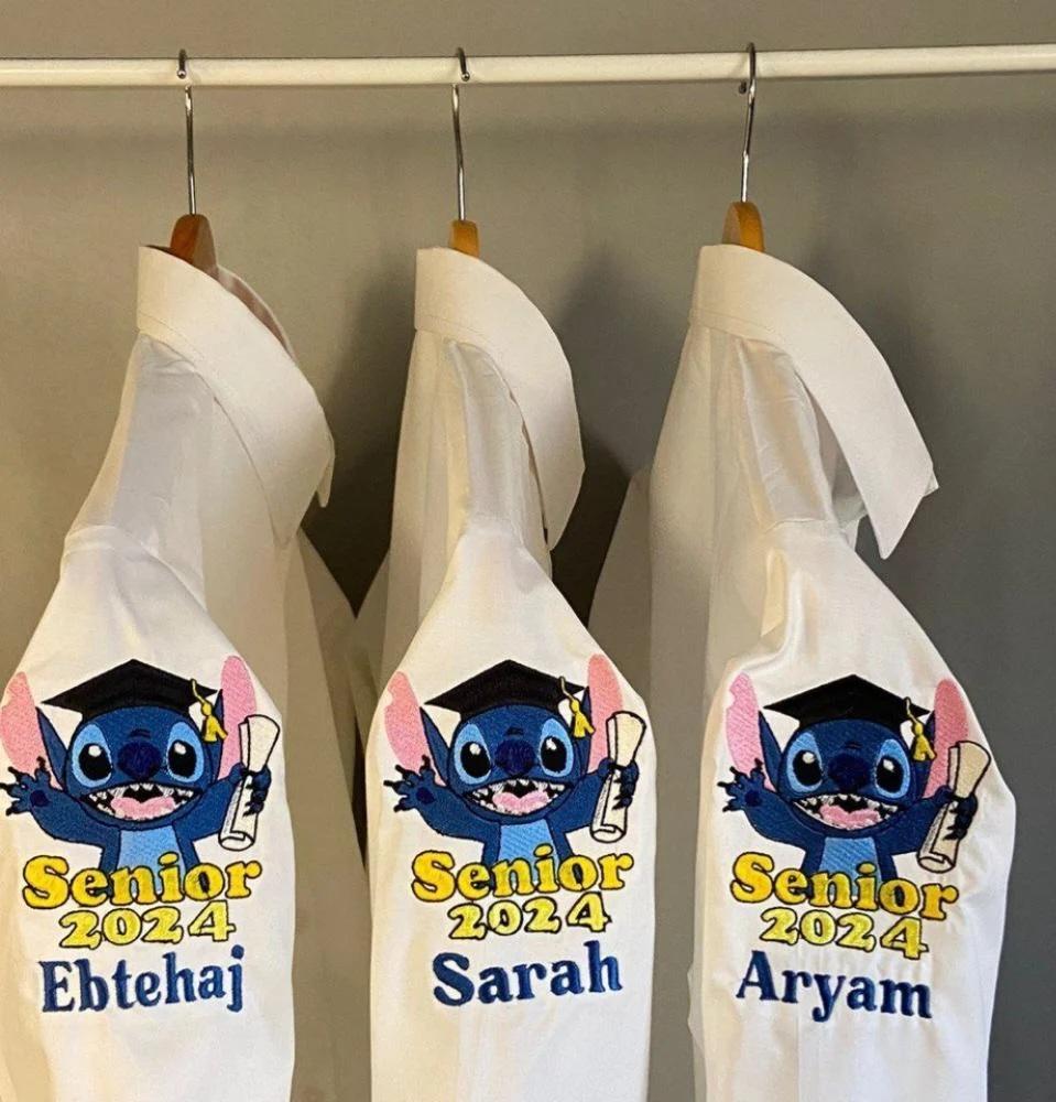 قميص مدرسي بأكمام طويلة و ياقة مثلثه نوع القماش هندي فاخر بتطريز صورة ستيتش على اليد اليمين مع تطريز الاسم و سنة التخرج