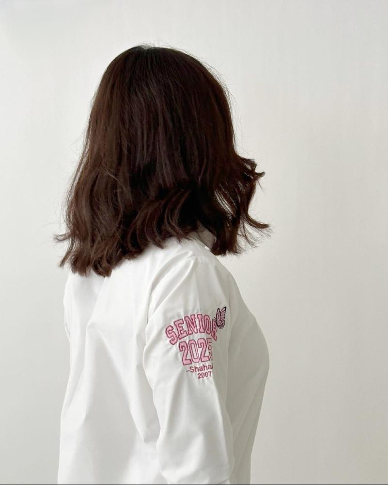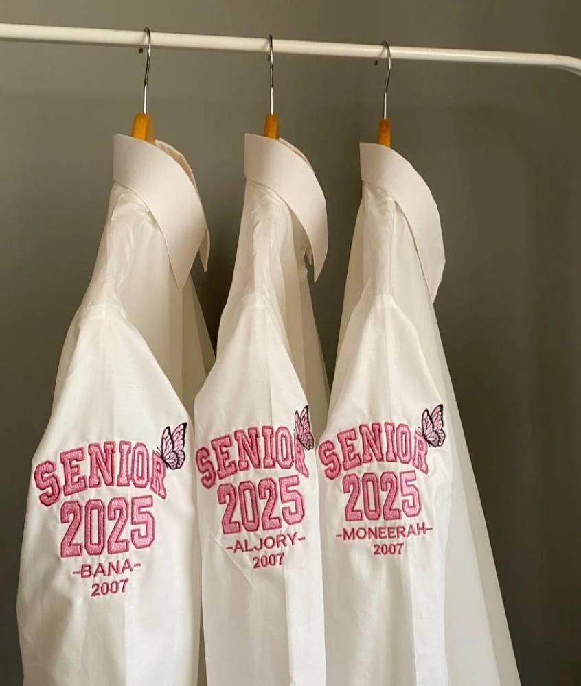 قميص مدرسي بأكمام طويلة و ياقة مثلثه نوع القماش هندي فاخر بتطريز SENIOR 2025 على اليد اليمين مع الاسم و سنة الميلاد