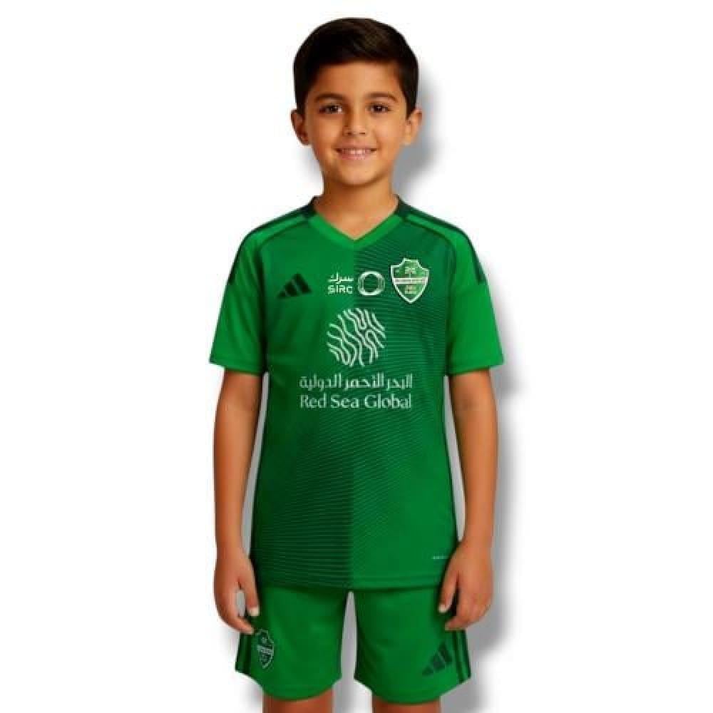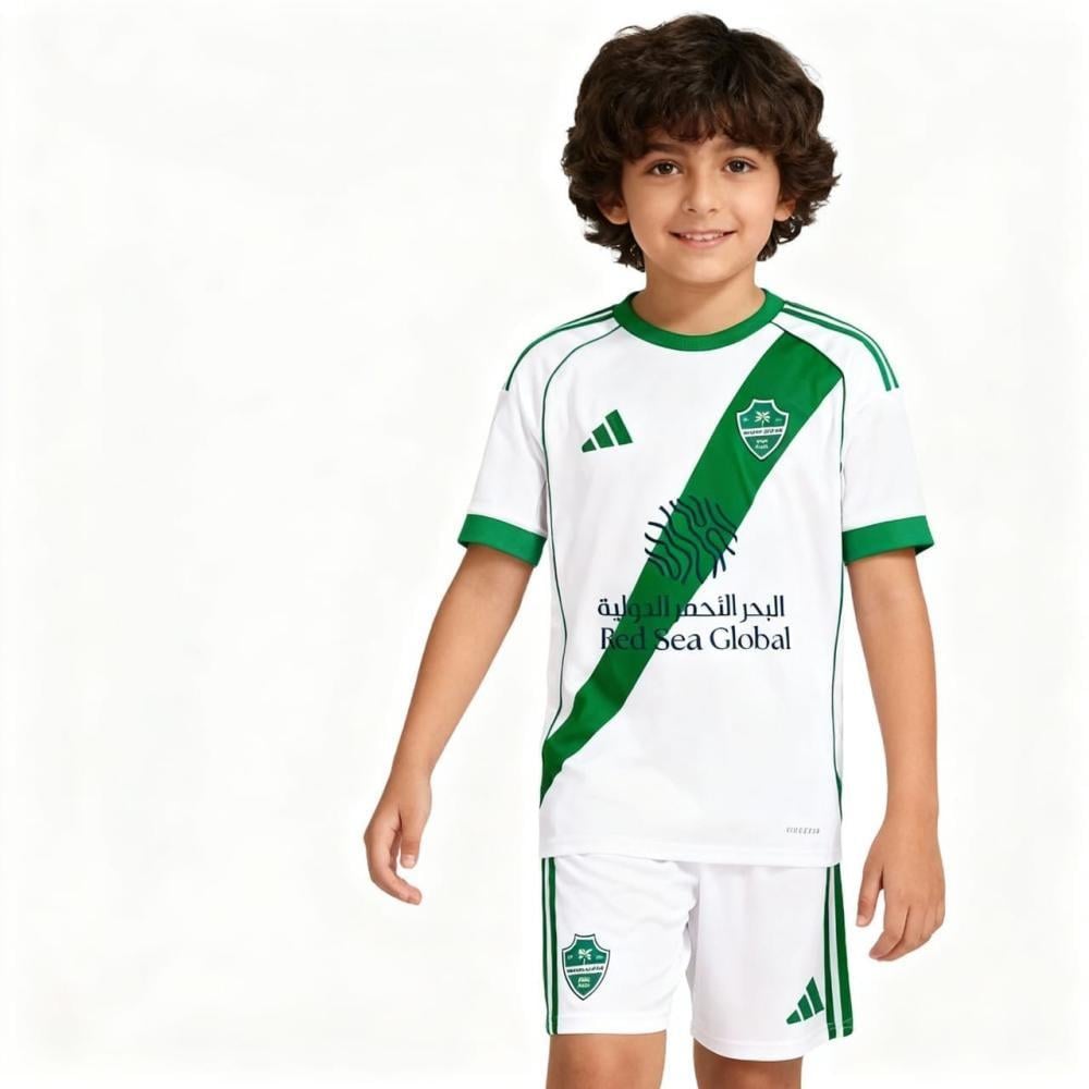 طقم الأهلي الاحتياطي للأطفال موسم 2026 باللون الأبيض يأتي بتصميم أنيق وعصري، يتميز بخط مائل عريض باللون الأخضر يتوسط القميص ليمنحه هوية النادي الواضحة.