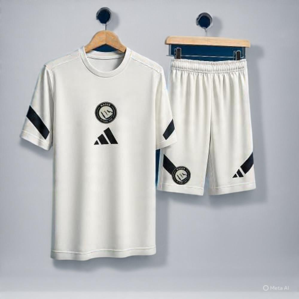 طقم تدريب النصر الأبيض الجديد 2026 بتصميم أنيق يجمع بين البساطة والفخامة التي تميز العالمي. يأتي باللون الأبيض الكامل مع لمسات ذهبية