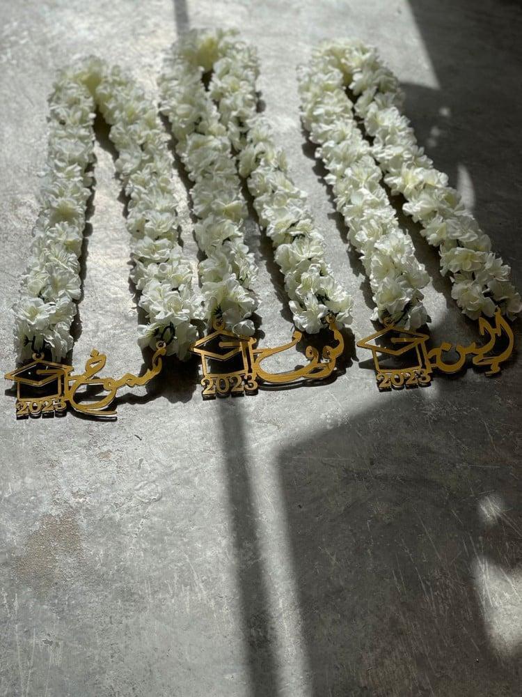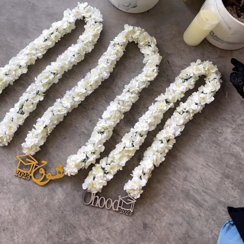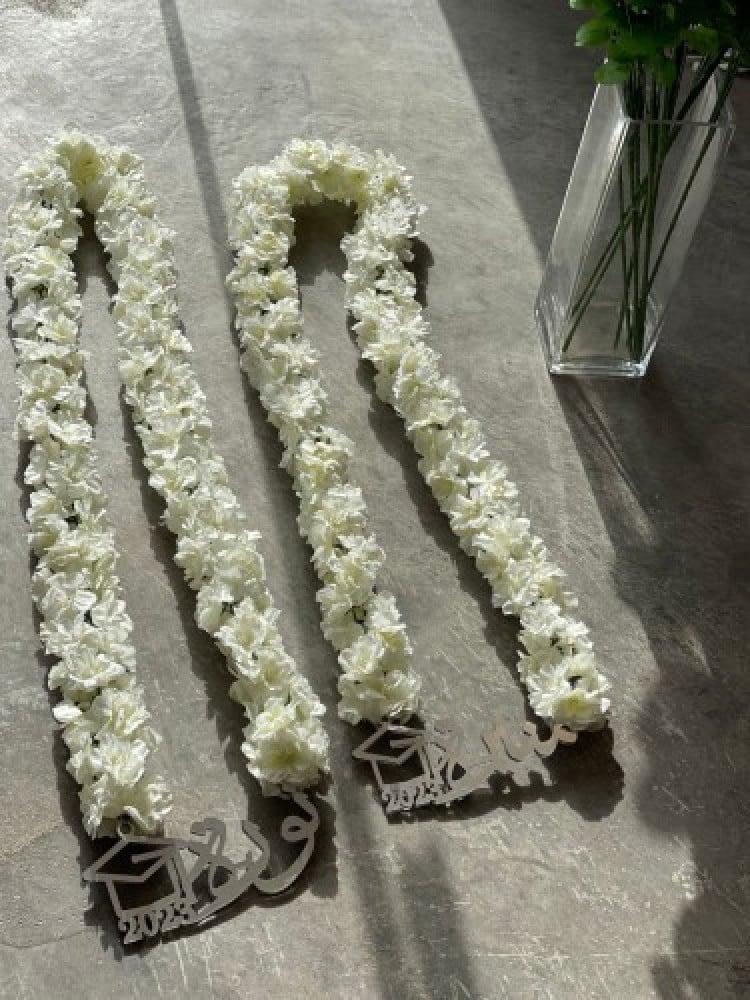 عقد تخرج مزين بالورد الطبيعي والاسم، بتصميم راقٍ يضيف لمسة فريدة ومميزة ليوم التخرج الخاص.